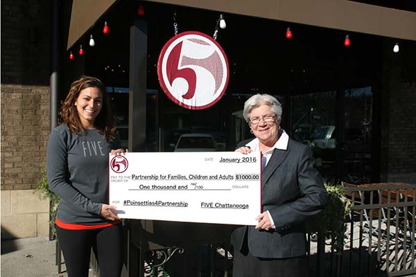 The restaurant FIVE has presented the Partnership for Families, Children, and Adults with a $1,000 check after a month-long campaign to support the local nonprofit.