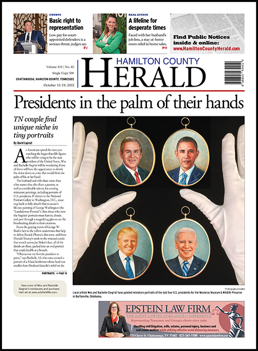 The husband and wife share more than a last name; they also share a passion, as well as considerable talents, for creating miniature paintings, including portraits of U.S. presidents. If visitors to the National Portrait Gallery in Washington, D.C., must step back to fully absorb that museum’s life-size painting of George Washington (the “Landsdowne Portrait”), then those who view the Siegrists’ portraits must lean in, closely, and peer through a magnifying glass to see the breathtaking details in their creations.