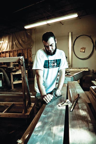 After five years of building antiques and new furniture, the Sears wanted to move back to the South. They spent six months looking and decided on Chattanooga. “We really liked the similarities to Portland that Chattanooga had. There was a river downtown, a huge environmental movement just getting started six years ago, all these LEED projects that were starting, and I wanted to open a woodshop that was environmentally sound and also respected my employees as far as the chemicals we used and the environment they worked in.”