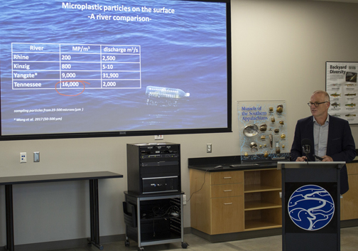 On Oct. 10, Fath visited the Tennessee Aquarium Conservation Institute to discuss his findings based on daily water quality tests and samples collected during his swim. To provide context to the results, he compared the Tennessee River’s levels to those he found in Germany’s Rhine River, which he swam and analyzed in 2014.