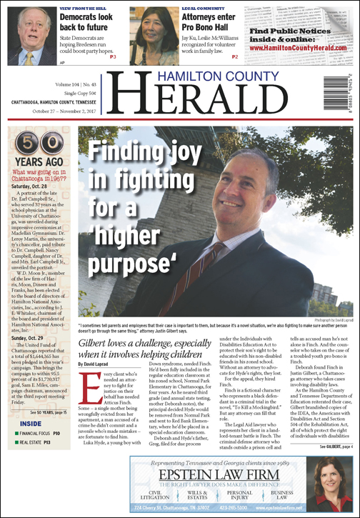 A family photograph in Gilbert’s office shows a cluster of bright smiles. As the attorney gathers together with a few of his clients one afternoon at Centennial Park in Chattanooga to celebrate their victories, a similar smile has formed on the face of Hyde, who today is in a classroom with his non-disabled friends because of the work Gilbert has done.