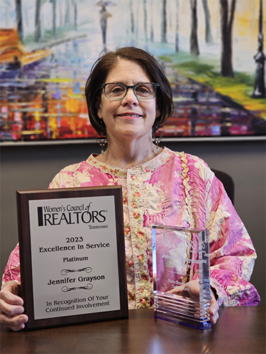 Jennifer Grayson, managing broker of Crye Leike Realtors on Gunbarrel Road in Chattanooga, has received the Platinum Excellence in Service award (left) from the Tennessee State Women’s Council of Realtors. The award recognizes member involvement at every level of the Women’s Council of Realtors and is the highest honor the organization gives to its members. Grayson’s involvement with the Chattanooga chapter of the Women’s Council of Realtors in 2023 included serving as the chapter’s state liaison, as recognized with her second award (right).
