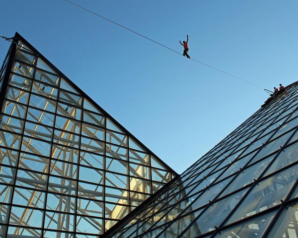 Highliner Edward Yates last weekend used a nylon webbing system to cross the glass peaks above Chattanooga’s Tennessee Aquarium. “There has never been an urban highline event like this before,” said Yates. “I’ve always loved the Tennessee Aquarium, and this has been a dream of mine.”