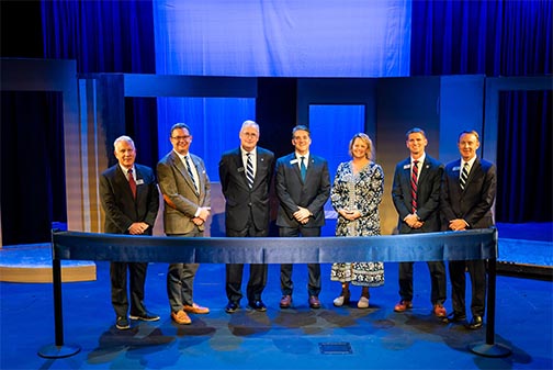 Leaders from Covenant College gather onstage during the ribbon-cutting ceremony marking the completion of renovations to Sanderson Auditorium in Sanderson Hall. The project modernized the well-known theater and classroom space with updated audiovisual technology, ADA-accessible features and refreshed interiors to support both academic and performance uses.