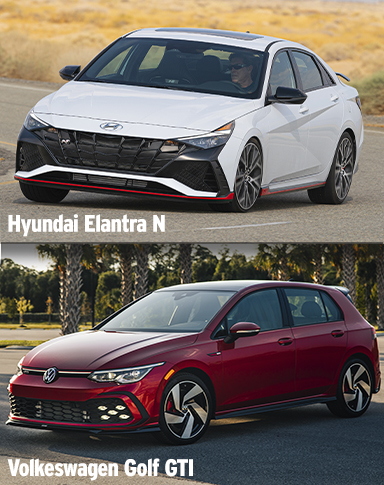 Volkswagen’s Golf GTI doesn’t have as big of a touch screen but it lets you connect with Apple CarPlay and Android Auto wirelessly. You have to use a USB cord in the Elantra. The GTI also comes with traffic-adaptive cruise control, which Hyundai doesn’t equip to the N version of the Elantra. Then there’s the extra cargo-carrying versatility afforded by the GTI’s hatchback body style.