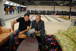 Claudio Rondon and Larry Bielski, general contractors for W Rondon/Architects Construction Group LLC, discuss the finishing touches for the Pin Strikes facility on the couches that replace the traditional hard seating of typical bowling allies. Pin Strikes opened Nov. 10 as a multi-activity family entertainment center that includes indoor bumper cars, two-story laser tag, the Splitz Bar and Grill, an arcade with over 70 games, a “Balladium” and, of course, plenty of knock down family fun bowling.