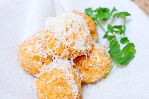 Heat the oil in a deep fryer to 350 degrees F. Fry the mac and cheese balls until they’re golden brown and the centers are hot – about five minutes. Serve hot, sprinkle with grated Parmesan Cheese, and with Marinara or Alfredo sauce for dipping.