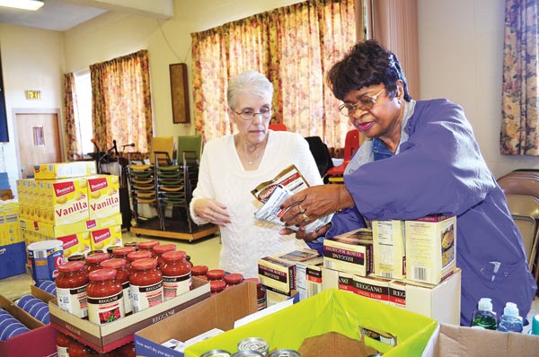 Eight long tables in the activity center at First Baptist Church at St. Elmo are groaning with laundry detergent, toilet paper, paper towels, cleaning supplies, and enough non-perishable food to feed a small army. The stacks of goods are higher than some of the people working to divide everything into baskets.