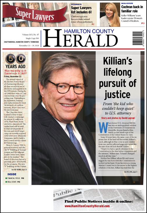 During three decades as a sole practitioner in Jasper, Killian successfully defended clients in such grim matters as rape, embezzlement and homicide. While his representation was of vital importance to his clients, the size of those cases paled in comparison to the enormity of the matters he pursued as U.S. attorney for the 41-county Eastern District of Tennessee.