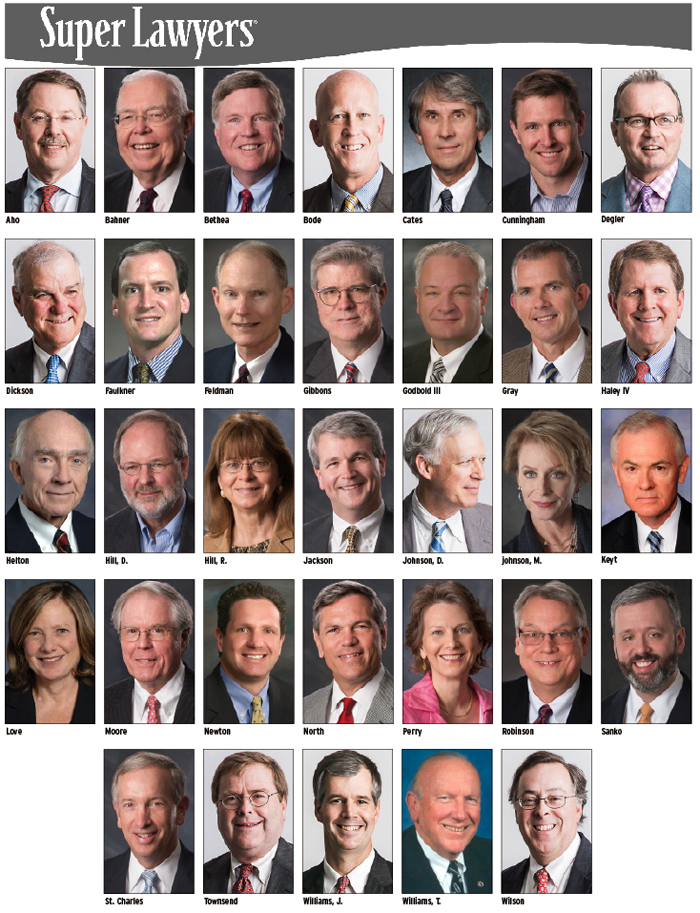 Super Lawyers at the firm include: Max Bahner, business litigation; Richard Bethea, business litigation; Mark Cunningham, health care; Timothy Gibbons, construction litigation; David Hill, intellectual property; Rosemarie Hill, employment and labor; Anthony Jackson, media and advertising; Hugh Moore Jr., civil litigation – defense; Harold North Jr., bankruptcy – consumer; Dana Perry, estate and probate; and Michael St. Charles, real estate.