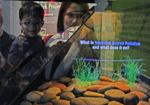 The imagery hovers in a kiosk over a bed of actual river rocks and is viewable from all angles. As the animation begins, viewers see a 3D projection of life in a healthy stream, with fish laying eggs and aquatic insects crawling among the stones. Later, erosion from nearby hills sends silt into the water, clouding the scene, smothering the eggs and eventually causing the animal life to disappear.