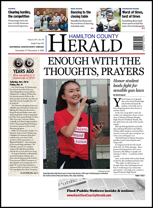 Yang says the walkout was a strong first step toward creating awareness of the need for common-sense gun laws. It also was her last step in Florida, as her family moved to Signal Mountain at the end of that school year.