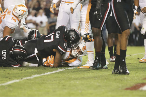South Carolina’s pressure got to Dobbs, who was sacked twice and took several hard hits on runs (55 yards, 12 carries).
