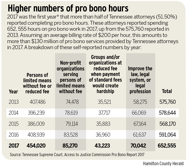 As of Dec. 31, 2017, 51.50 percent of the 17,223 active attorneys licensed in Tennessee with a primary address in the state reported participating in pro bono activity during 2016.