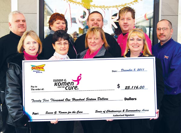 Chattanooga area Sonic representatives on December 8 presented a check for $25,116 to the local Susan G. Komen for the Cure affiliate to fight breast cancer. During October, which was Breast Cancer Awareness Month, Chattanooga area Sonic Drive-Ins held a Pink Ribbon Fundraising Campaign.