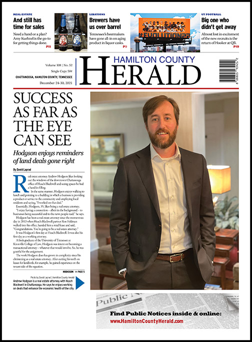 Real estate attorney Andrew Hodgson likes looking out the windows of the downtown Chattanooga office of Husch Blackwell and seeing spaces he had a hand in filling.