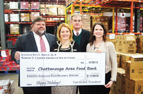 On December 20, attorney Tim Mickel presented Maeghan Jones, president of the Chattanooga Area Food Bank, with $14,400 in donations from the lawyers and judges who are members of the Chattanooga Chapter of the American Inns of Court. Over $11,000 of the donation was raised at an auction held during the Inn’s annual Holiday Party. The remainder came from private donations made by Inn members.