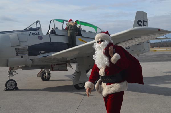 TAC Air on Friday, Dec. 20 hosted its third annual Cool Yule Fly-In as a way to spread holiday cheer to families and children from the Partnership. The event featured Santa flying in on a vintage T-28 Navy Trainer, as well as gifts and lunch for the children visiting. The Forgotten Child Fund arranged for a fire truck to be on display for the children to tour. (David Laprad)