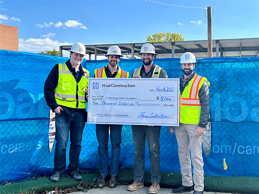 HOAR Construction donates $5,000 to the First in the Family Scholarship during Chattanooga State’s 29 Days of Thanks & Giving in November. From left: Lane Kintner, HOAR project engineer; Paul Burkholder, project manager; Taylor Johnson, project superintendent; and Will Gaither, project executive. HOAR is building Chattanooga State’s $21.7 million Advanced Manufacturing Building, a 50,000 square foot, two-story workforce training facility scheduled to open in 2024.