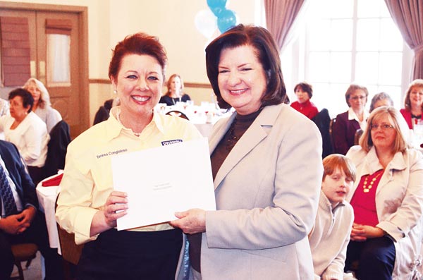 Coldwell Banker Pryor Realty owners Bill and Peggy Pryor hosted their company’s Awards and Recognition luncheon Tuesday, Feb. 11 at the Chattanooga Choo Choo Hotel. The Pryors annually recognize their agents at their Chattanooga, Tenn., and Dayton, Tenn., offices for their accomplishments during the previous year and encourage them to continue their success during the upcoming months. Pictured: Ann Martin (right), the broker of the Chattanooga office, hands Teresa Congioloso of the Dayton office her award for selling the most units company-wide in 2013. This was just one of many awards Congioloso received, although no one attending the luncheon left empty-handed. (David Laprad)