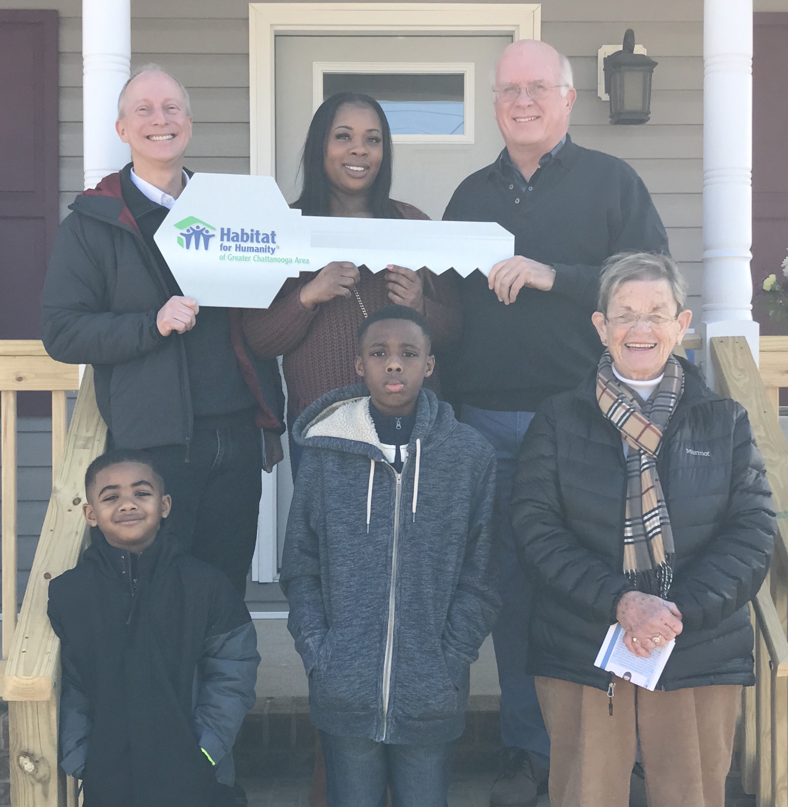 Pictured in the back row are Don McDowell, Habitat board president; Habitat homeowner Latoya Pollard; and David Butler, Habitat president and CEO. Pictured in the back row are Pollard’s sons – Terrance Bivens and Jatorrey Gilmore – and longtime Habitat partner Starlett Speakman.