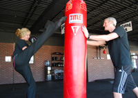 The presentation is unlike any other fitness center. One-hundred pound punching bags hang from the ceiling like slabs of beef in a meat locker. Spongy black tiles cover the base of the gym, creating a comfortable surface for jumping rope, side-stepping and landing roundhouse kicks. And large numbers mark each station on the circuit, leading clients through a vigorous regimen.