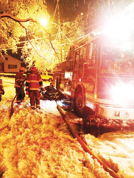 Battalion Chief Rick Boatwright said it was very difficult for the fire trucks to get to the scene, and it was almost worse getting back out. Water from the fire hoses mixed with the snow to make for a slippery slush. The firefighters found it fairly effective to use their fire hoses to wash the snow and slush off the road, which eventually enabled them to leave.