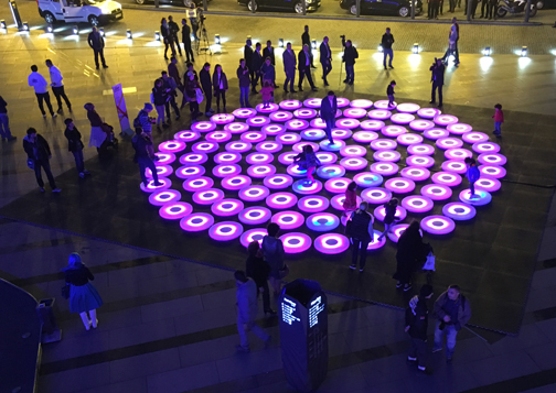 Made up of 40,000 LEDs on 106 computer-powered three-foot discs arranged in concentric circles, the piece activates when someone steps on the pads, setting in motion colored light effects.