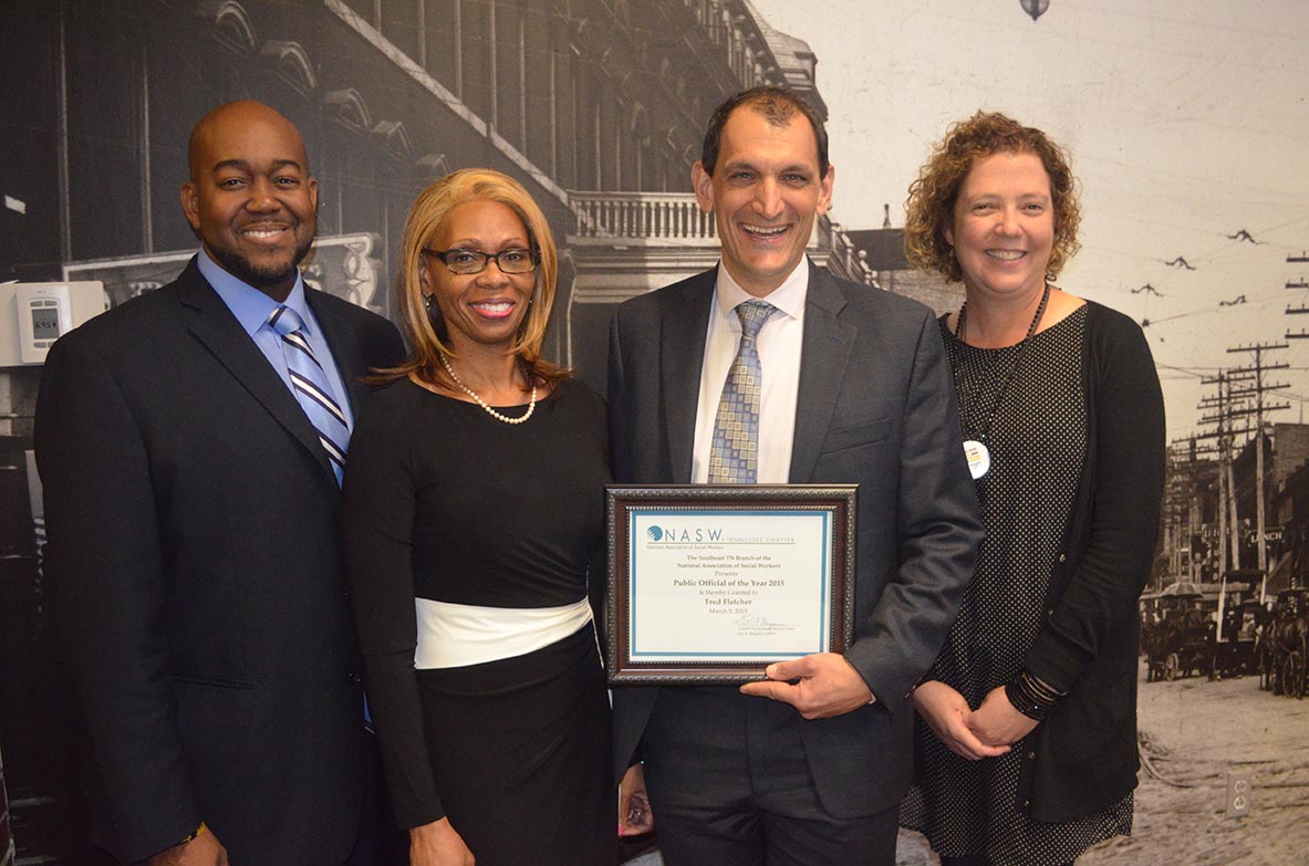 Chief of Police Fred Fletcher received the Public Official of the Year award from the local chapter of the National Association of Social Workers in a ceremony held March 5 at Bessie Smith Center. The Public Official of the Year Award recognizes outstanding service and contributions of a governmental official who has shown leadership in the formulation of public policy that affects social justice, health care, education, civil and human rights, and social practice. Pictured [L-R]: Dr. Paul David Smith, public safety coordinator; Prof. Lucilla Nash, Chattanooga State Community College; Fletcher; and Valerie Radu, executive director of the Family Justice Center. (Photo by David Laprad)