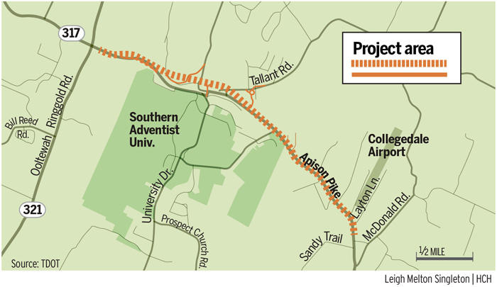 Work is slated to begin soon on the 3.4-mile project to widen and improve the Apison Pike corridor from SR321 (Ooltewah-Ringgold Road) to east of Layton Lane near Collegedale Municipal Airport.