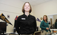 While Huffman is demonstrating the Pocket Talker, lights in the Technology Center begin to blink, and a circular device on a table near her starts to rattle. Assistive Technology Specialist Mitzi Davenport points to the Clarity AlertMaster as the source of the commotion, and says it’s connected to a wireless network that lets her know a client needs assistance. A variety of devices can be networked to an AlertMaster, including baby monitors, doorbells, motion detectors, smoke detectors and more.