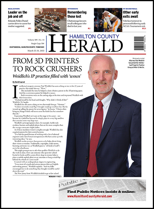 Weidlich spent the next 22 years doing IP work at Chambliss, Bahner & Stophel in Chattanooga. Although he lost his New Jersey accent over time (it now comes out only when he’s mad, he says), he gained experience and expertise in his field as he worked with clients in a variety of industries.