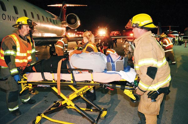 The Chattanooga Fire Department on Tuesday, March 25, participated in a full-scale exercise with several other emergency response agencies at the Chattanooga Airport. The exercise, which began at 2:30 a.m. to avoid disrupting normal operations at the airport, involved a real plane, which was loaned to the fire department for the training. The department used its recruits in Fire Academy 2014 as mock victims. Emergency personnel triaged the “patients” and transported them by ambulance to another part of the airport.