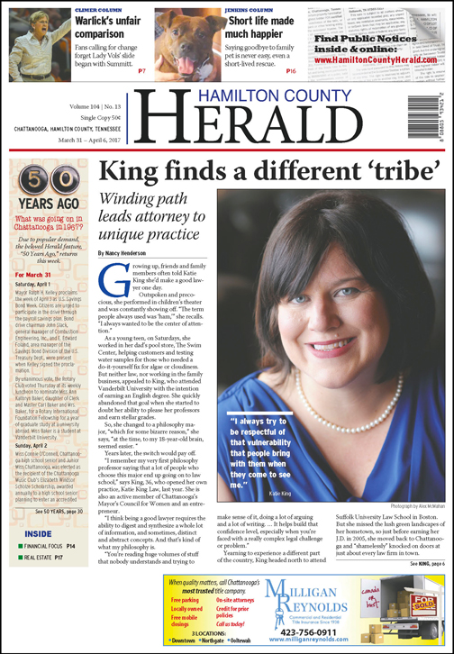 “I remember my very first philosophy professor saying that a lot of people who choose this major end up going on to law school,” says King, 36, who opened her own practice, Katie King Law, last year. She is also an active member of Chattanooga’s Mayor’s Council for Women and an entrepreneur.