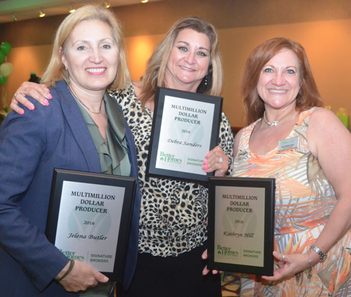 From there, broker and owner Gina Sakich and agent Jeremy Callahan honored the company’s staff, hosted a real estate version of “Who Wants to Be a Millionaire” and drew door prizes (including a year of MLS fees) as everyone enjoyed the open bar and heavy hors d’oeuvres. Pictured: Realtors Jelena Butler, Debra Sanders and Kathryn Hill display their Multimillion Dollar Producer Awards.
