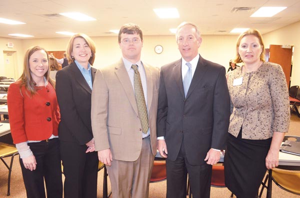 Four Chambliss & Bahner attorneys on Tuesday, March 4 presented a course titled “What every real estate broker needs to know about commissions, contracts, and title insurance” to Southeast Tennessee Chapter of the Certified Commercial Investment Members. Presented by Chambliss attorneys (L-R) Kirby Yost, Rachel Edwards, Michael Stewart, and Mike St. Charles, the course covered two hours of TREC approved educational material. The instructors also discussed new cases affecting the liability of owners and developers. Pictured with the attorneys at the Greater Chattanooga Association of Realtors, where the course was taught, is Jelena Butler, 2014 CCIM president. (David Laprad)