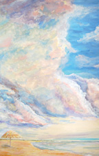 The blank canvas allowed Hobbs to go in a new direction. She’d fallen in love with a painting of a “beautiful, slopped on sky” she’d seen at an auction, and called her friends who were painters to see what they’d do with the same theme.