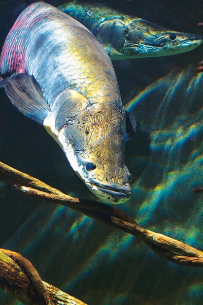 Redtail catfish, feisty fish with unique markings and very long whiskers, will be another crowd favorite. They’ll be found prowling near the bottom of the exhibit while prehistoric-looking arapaima slowly patrol the waters above. Demas predicts guests will snap a lot of pictures of these massive predators. “The arapaima don’t just look powerful, they’re more than 100 pounds of pure, angry muscle.” Demas and other staffers have been in the water working with lots of massive fish while getting the exhibit ready for visitors.