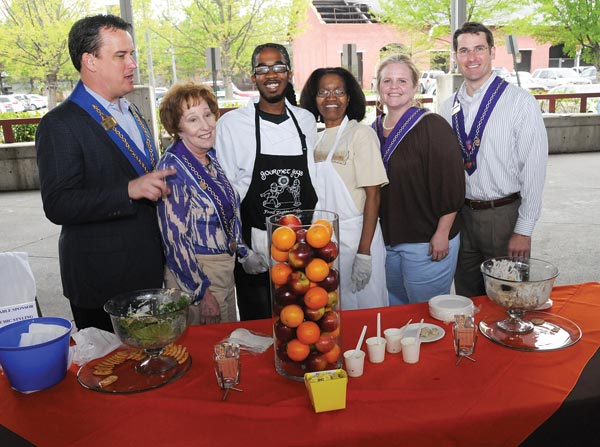 Richard Goodloe of RL Catering won the grand prize at Gourmet Guys for his chicken corn chowder, as well as first place in the soups, stews and chili division. He won first place for his chicken salad in the side division, too. Pictured (L to R) are judges Patrick Emanuel and Rachel Savage; winners Richard Goodloe and his mother, Barbara Allen; and judges Meghan Scanlon Roach and Jonathan Emanuel. Not pictured: Warren Barnett, judge. Gourmet Guys is a food-tasting gala pitting dozens of chefs against each other in an amateur event. Attendees are able to taste all kinds of appetizers, soups, sides, salads, entrees and desserts, and vote for their favorite chefs. Three Chattanooga Rotary Clubs teamed up to sponsor the 2012 Gourmet Guys Food Tasting Gala on March 24. Proceeds from the event will be used to support initiatives for needy children locally and internationally. (Photo provided)