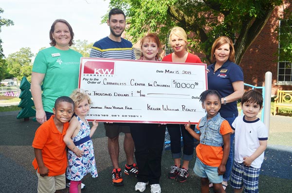 Keller Williams donates the proceeds from its 2015 Vendor Fair to Chambliss Center for Children. The real estate firm raised $10,000 at the annual event, held in April. Pictured (L-R): Katie Harbison, director of Chambliss; Nathan Brown, Keller Williams Downtown team leader; Keller Williams Realtor Janet Henninger; Tammy Dale, HSA Home Warranty, a participating vendor; Kim Carman, Arrow Exterminators, a participating vendor; and a few of the three-year-olds attending Chambliss. (Photo by David Laprad)