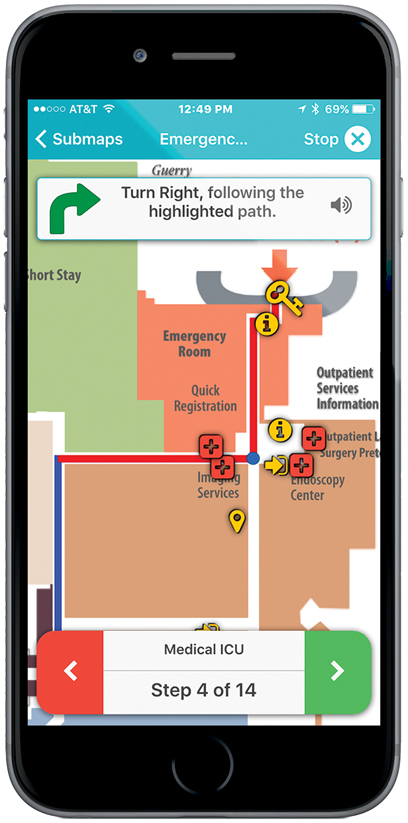 Once the user selects a destination, the CHI Memorial app draws the path on the floor plan on the user’s smartphone and provides turn-by-turn instructions.