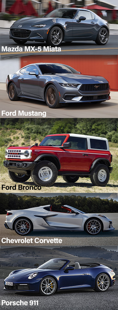 Open-air vehicles like the rugged Ford Bronco, lithe Mazda MX-5 Miata roadster, and rapid Chevrolet Corvette prove sun-soaked driving adventures are still available.