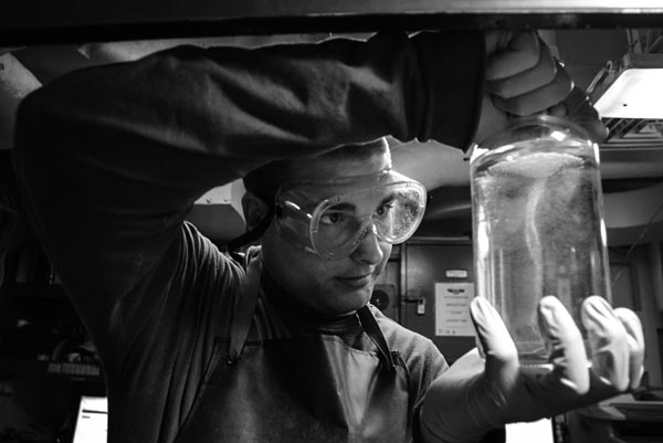 Aviation Boatswain’s Mate (Fuels) Airman Stephen Scott, from Chattanooga, Tenn., conducts quality assurance on aircraft fuel in the V-4 division office aboard multipurpose amphibious assault ship USS Bataan.