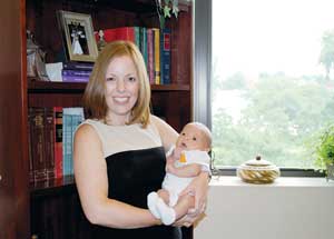 Laura Ketcham holds her six-week-old son, Andrew, during his first visit to her office at Husch Blackwell Sanders LLP. Ketcham has been with the firm for five years, specializing in insolvency and commercial bankruptcy from the lender’s side.