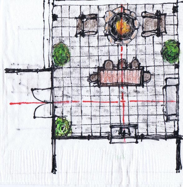 In this napkin sketch, I’ve shown a simple outdoor space adjacent to an exterior door of the house. By visually aligning the barbecue grill with this door, easy communication occurs through line-of-sight and gives the opposite side of the room an anchor point. Perpendicular to this axis, I lined up the fire pit with the center of the dining table, which directed an optimal location for the outdoor serving counter. Adding columns to the corners of the patio to support a roof further enhances the design and upgrades it into a deep sheltered space that can be enjoyed rain or shine. A few potted plants in the corners liven up the space and connect the hardscape to its surrounding natural area.