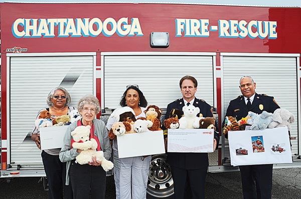 Unum employees in Chattanooga this week donated 40 teddy bears to the Chattanooga Fire Department. This was a leadership project for Unum employee Bettye Stein, who heard firefighters give teddy bears to children on fire and wreck scenes. Chattanooga firefighters regularly provide the teddy bears and other stuffed animals to children – and occasionally adults – who are often shaken up when they are involved in a home fire or car wreck. From left to right are Gezzetta Campbell, Stein and Trecia Smith, all with Unum, and Deputy Chief Chris Adams and Captain Anthony Williams with the CFD’s training division. (Photo provided)