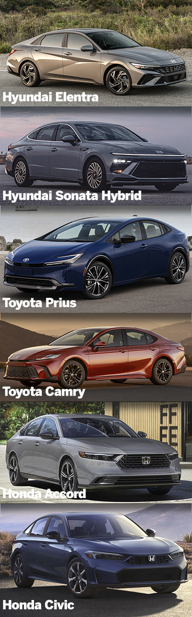 Each of these sedans gets excellent fuel efficiency and comes well equipped with features. The Prius continues to be the best choice for maximum mpg, but the other cars aren’t far behind and offer more interior space.