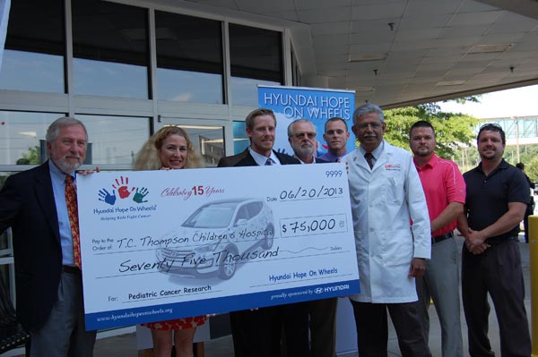 Hyundai Hope On Wheels and Chattanooga-area Hyundai dealers last week awarded a $75,000 Hyundai Scholar Grant to the Center for Childhood Cancer and Blood Disorders at T.C. Thompson Children’s Hospital at Erlanger to develop Southeast Tennessee’s first pediatric cancer survivorship clinic. Dr. Jennifer Keates, a pediatric oncologist from Children’s Hospital, is one of 40 recipients of a Hope On Wheels’ 2013 Hyundai Scholar Grant, which supports investigators known as Hyundai Scholars. Hyundai Scholars pursue research and implement clinical programs aimed at improving the lives of children battling pediatric cancer.