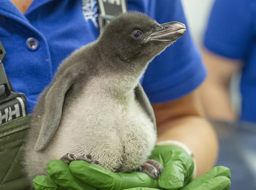 The first four weeks of life are fraught with obstacles to a chick’s survival. During this important period in their development, the birds have been continually observed on-exhibit and carefully removed by a team of animal care specialists for tri-weekly checkups by aquarium staff veterinarian Dr. Chris Keller.