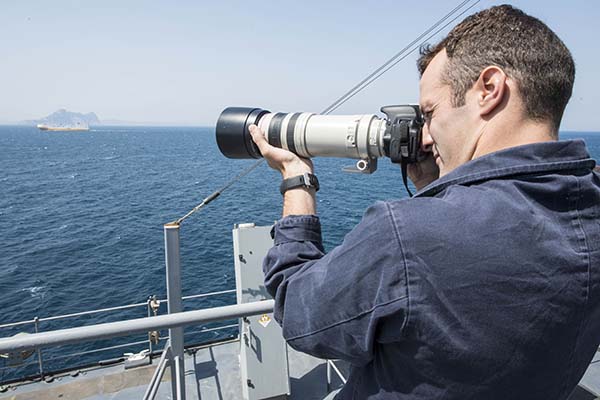 Quartermaster 2nd Class Andrew Wilson of Chattanooga records surface contacts during a westbound transit of the Strait of Gibraltar aboard the amphibious dock landing ship USS Fort McHenry on July 1.
